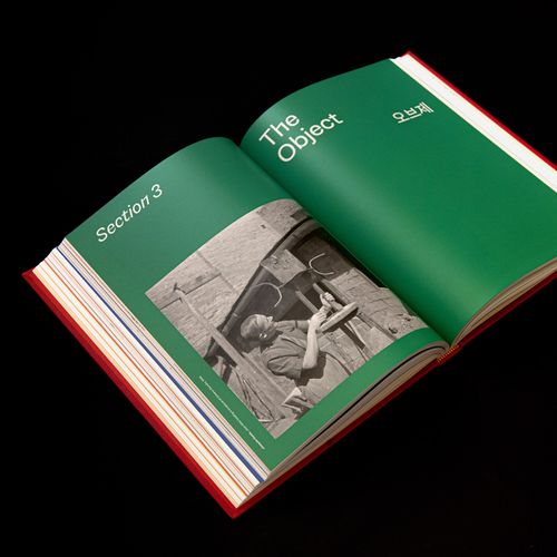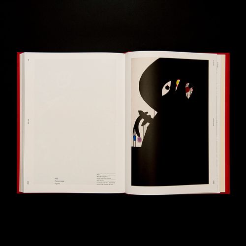 개별 작품 감상에 방해되지 않는 선에서 작품의 인상이 충분히 스며들도록 하는 것을 목표로 호안 미로 작품의 특징을 정제하여 적용했습니다. 작품의 심볼릭한 형태 표현과 어우러지도록 기하학적인 모습을 지닌 오흐탕크를 제목 글꼴로 사용하고 작품의 거칠고 역동적인 인상을 보조하기 위해 이탤릭체를 적극적으로 사용했습니다. 미로의 시그니처 컬러 황, 적, 녹, 청, 흑을 각각 꼭지별 주색상으로 매칭하여 섹션이 전환되는 순간을 환기해 줍니다. 주로 벽에 걸리는 회화 도판은 지면의 상단에, 주로 바닥에 놓이는 조소 도판은 지면의 하단에 배치했습니다.